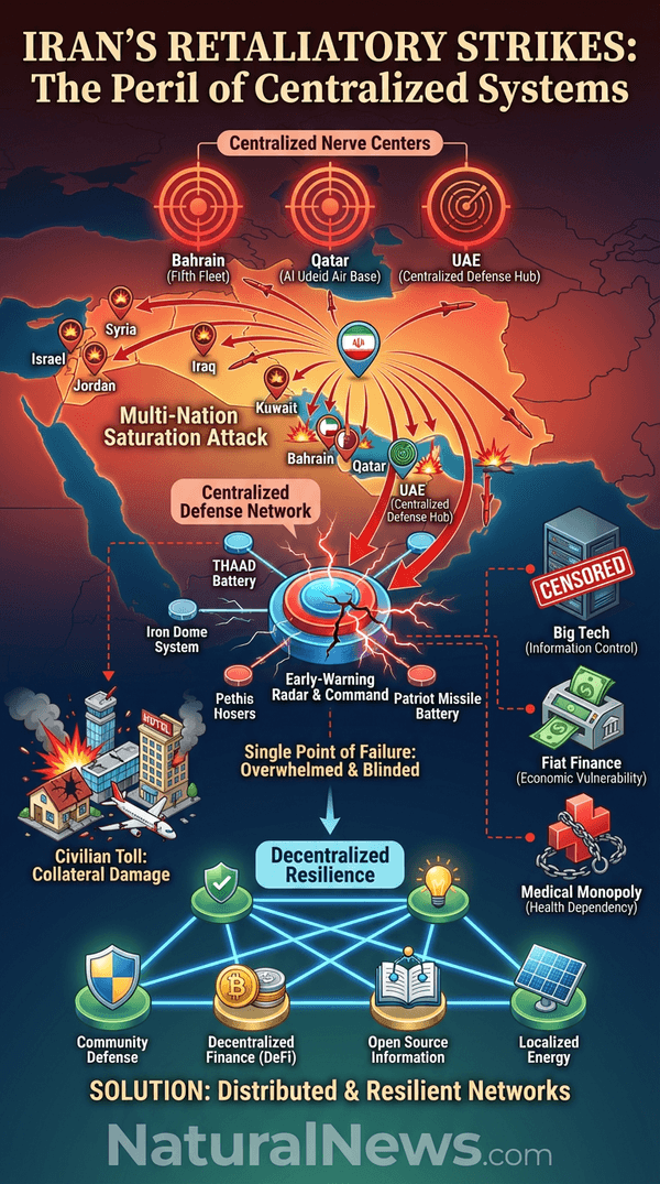 Just as a handful of Big Tech companies censor free speech and control access to information, or as central banks manipulate currency through fiat money printing that steals wealth from the people, centralized military infrastructure creates a tempting target whose disruption can have cascading effects. The U.S. military’s own internal assessments have warned of the significant risks of a protracted conflict with Iran, including the vulnerability of the 40,000 U.S. troops stationed as ‘sitting ducks’ across the Gulf [20][21]. The lesson is clear: decentralization — in finance, information, community infrastructure, and defense — is the path to resilience, while centralization is the blueprint for systemic collapse and tyranny.
