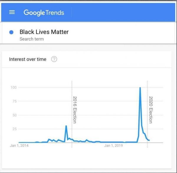 Google Trends data over time Shows Spikes in BLM searches around election periods, followed by a complete lack of interest. Are we all being manipulated by media, tech, and politicians for a broader purpose? https://trends.google.com/trends/explore?date=all&geo=US&q=black%20lives%20matter
